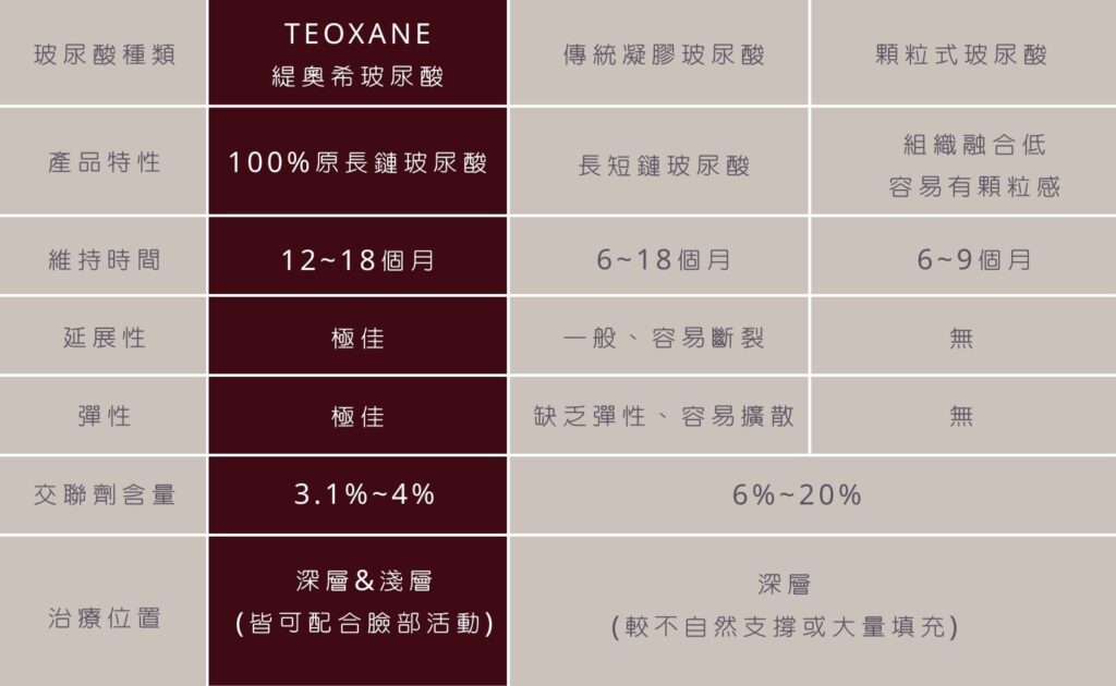 緹奧希 RHA® 玻尿酸模擬了皮膚中的天然玻尿酸,因此能更好的融入肌膚組織,同時能夠抵禦臉部表情所造成的內外壓力,不會因為受壓而變形;而當我們做表情拉扯時,玻尿酸會隨著表情延伸與回彈,不易有斷開的情形,填補過後的部位,能夠保持平整,不會出現團塊、看起來不會凹凸不平。